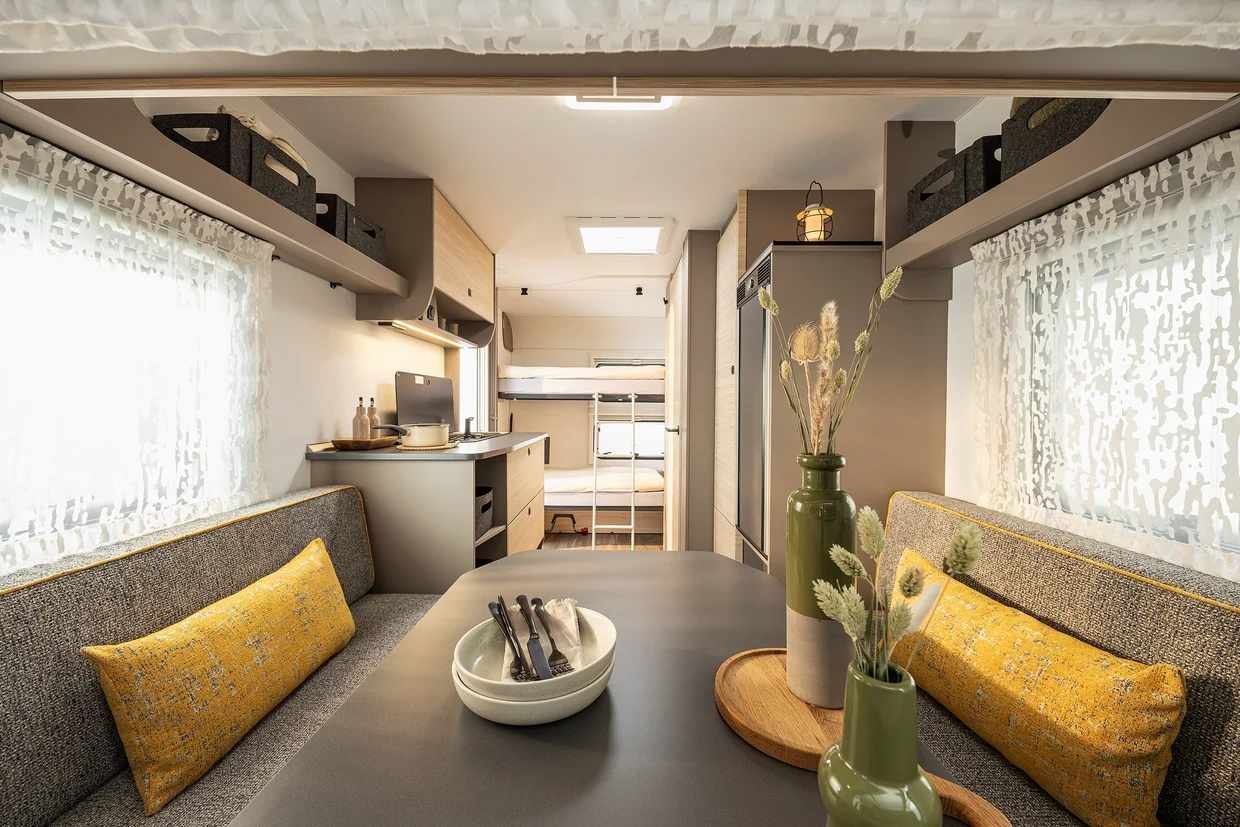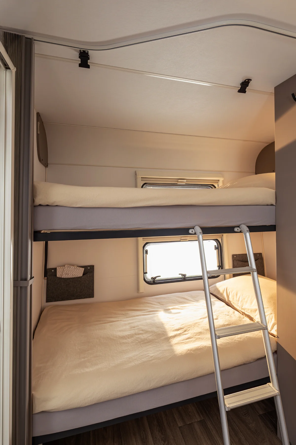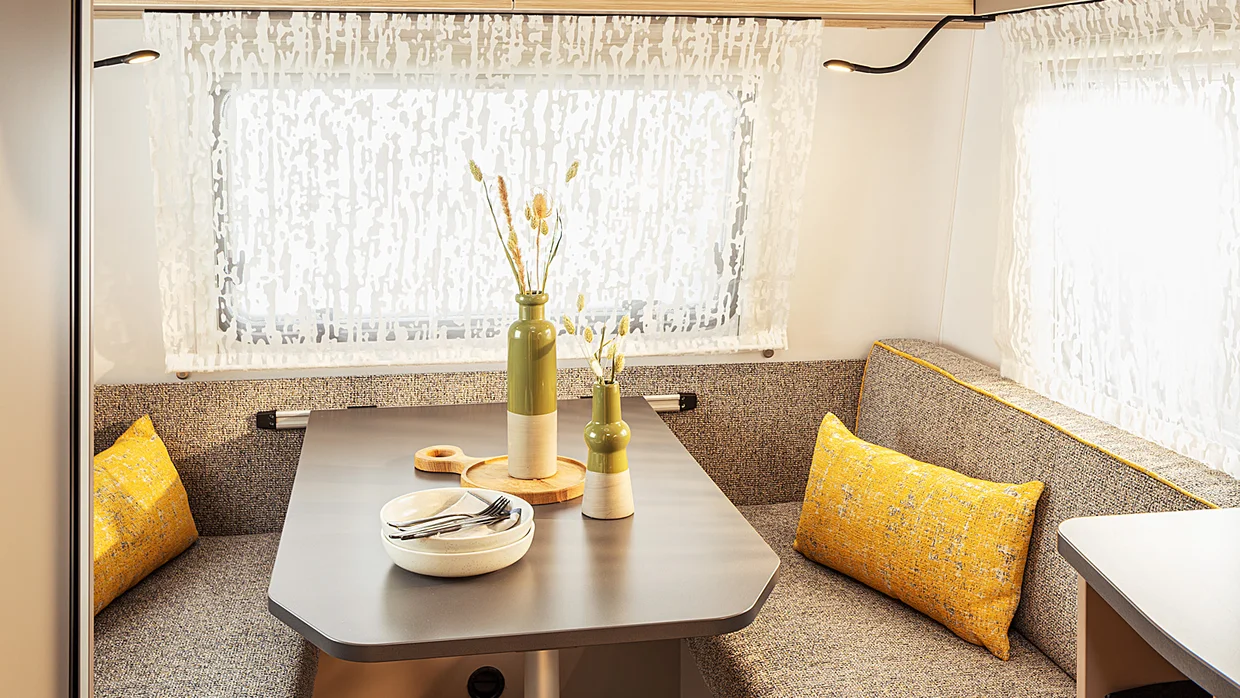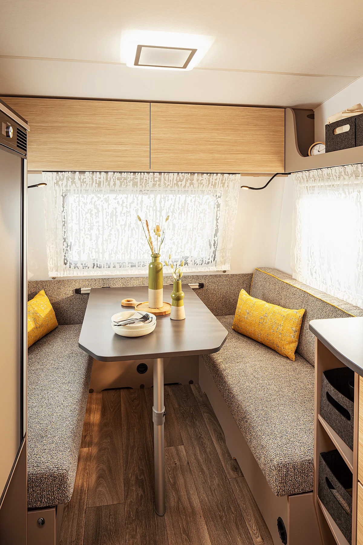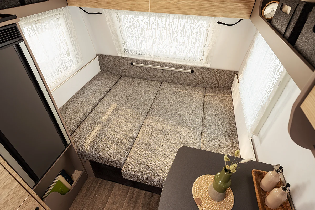 Uw favoriete plek op wielen: de zithoek nodigt uit om te blijven zitten. Drie grote ramen brengen licht en natuur naar binnen. Sfeervolle ledverlichting zorgt voor gezelligheid, praktische rolgordijnen voor privacy. Als het nacht wordt, verandert de zithoek in een paar eenvoudige handelingen in een comfortabel tweepersoonsbed.