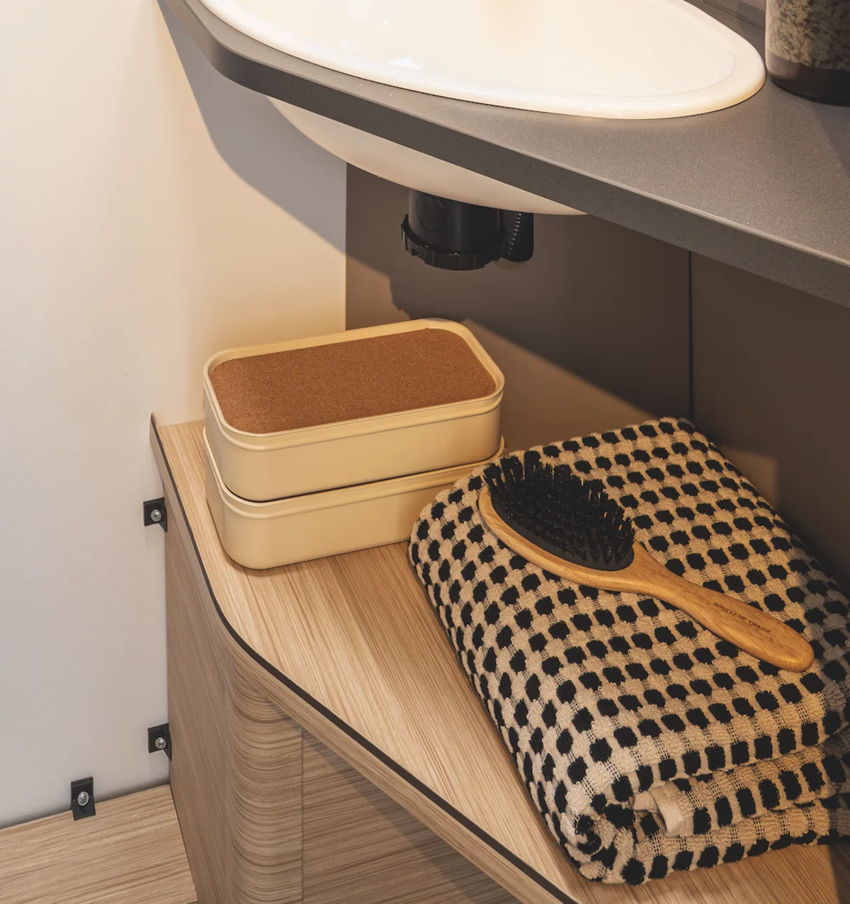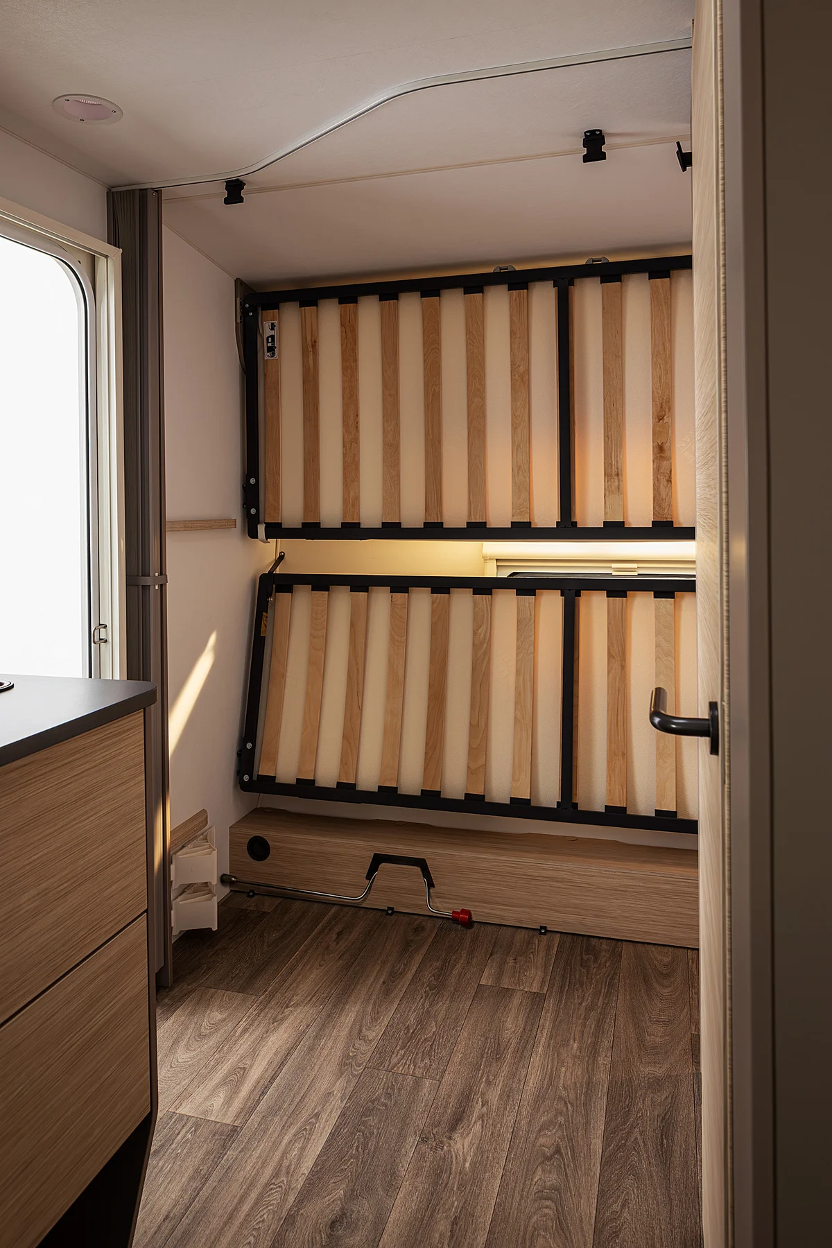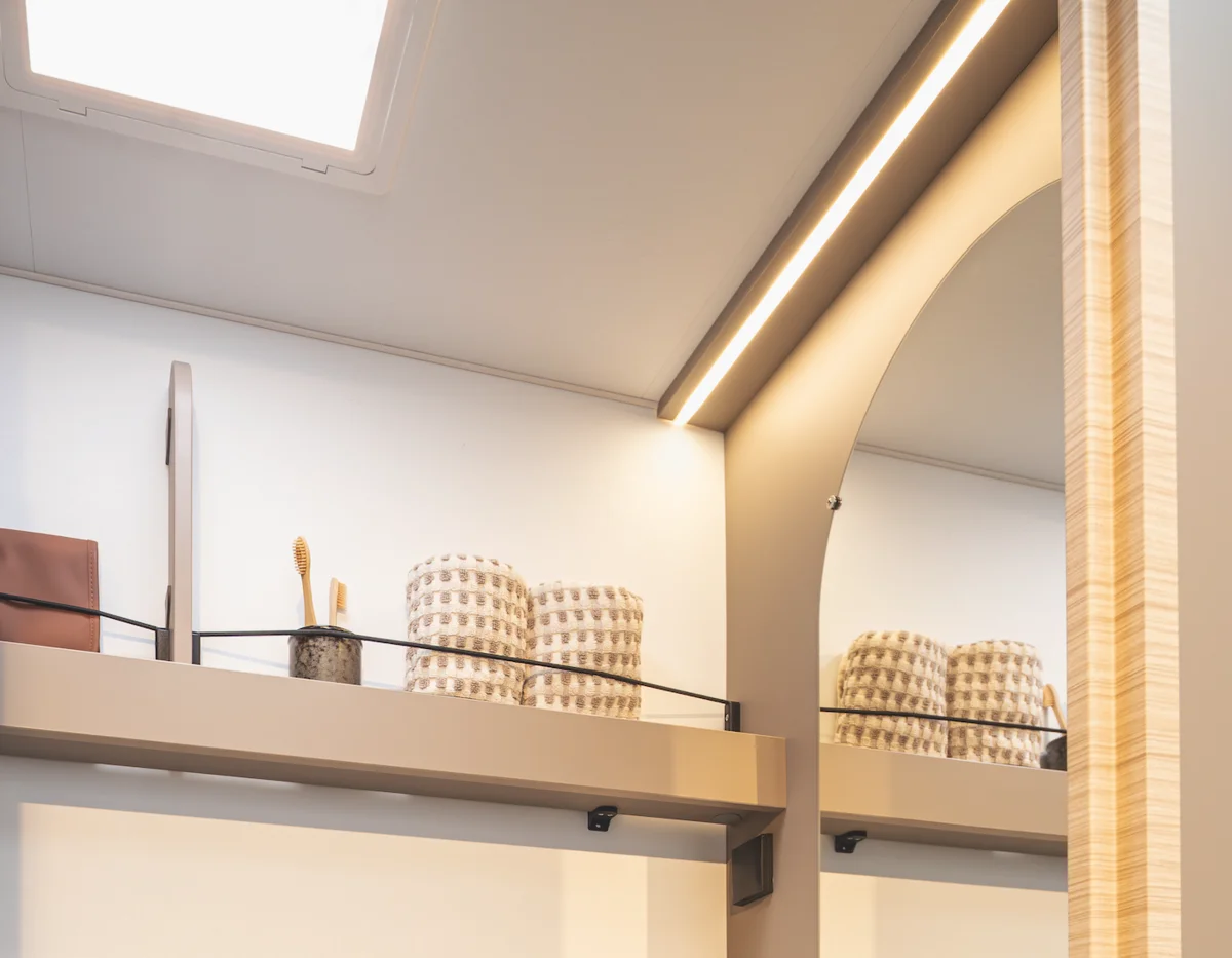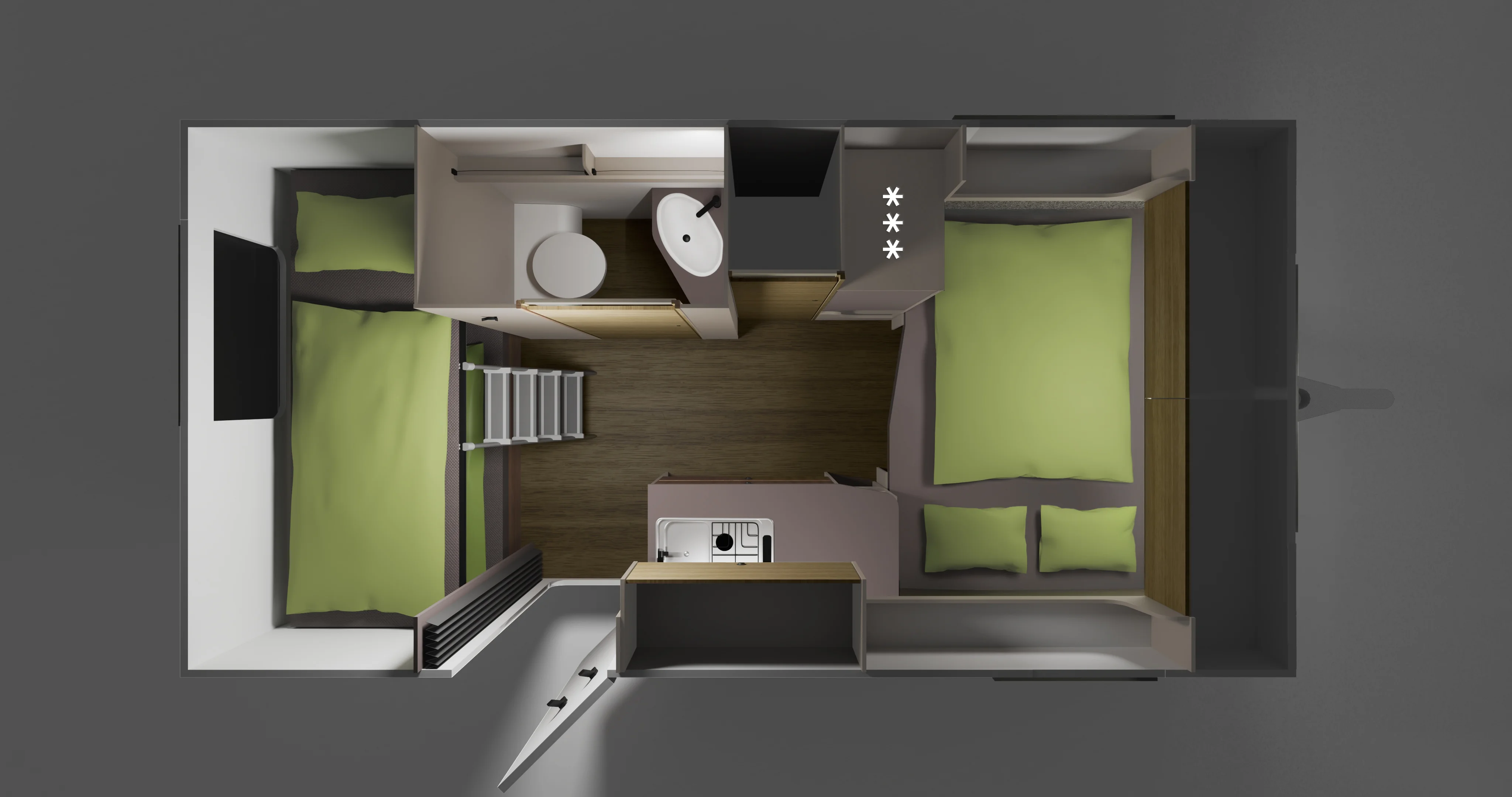 Uw favoriete plek op wielen: de zithoek nodigt uit om te blijven zitten. Drie grote ramen brengen licht en natuur naar binnen. Sfeervolle ledverlichting zorgt voor gezelligheid, praktische rolgordijnen voor privacy. Als het nacht wordt, verandert de zithoek in een paar eenvoudige handelingen in een comfortabel tweepersoonsbed.