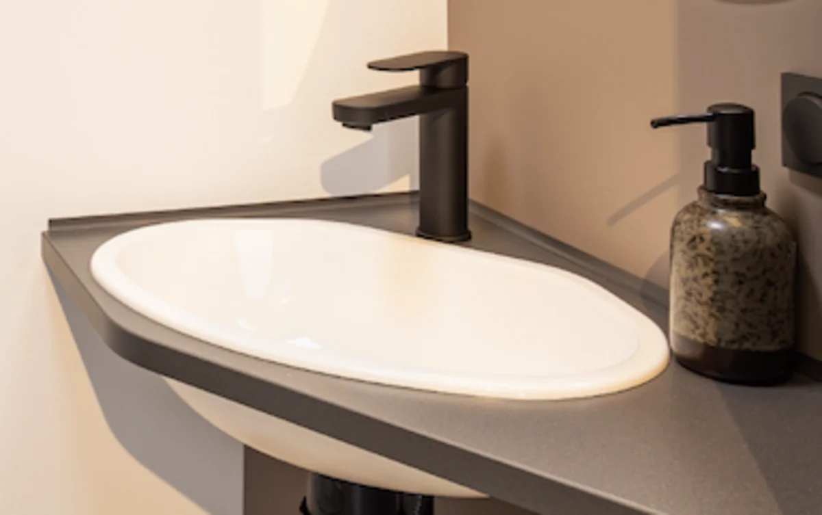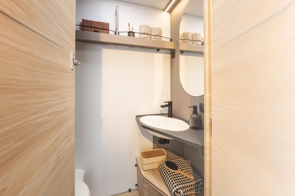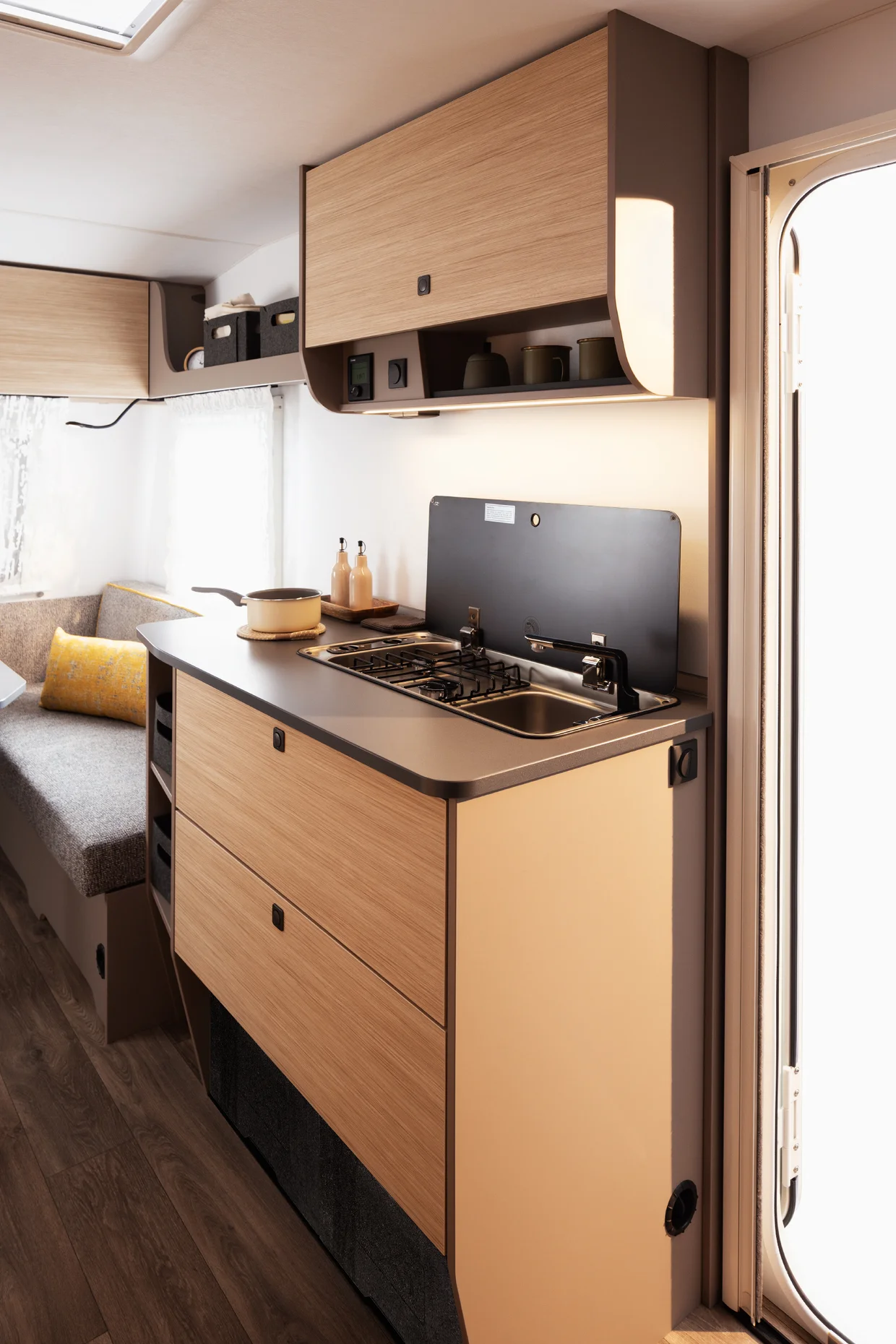 De compacte caravan met wasruimte en toilet biedt alles wat je nodig hebt om lekker te zitten, aangenaam te dromen en heerlijk te koken.